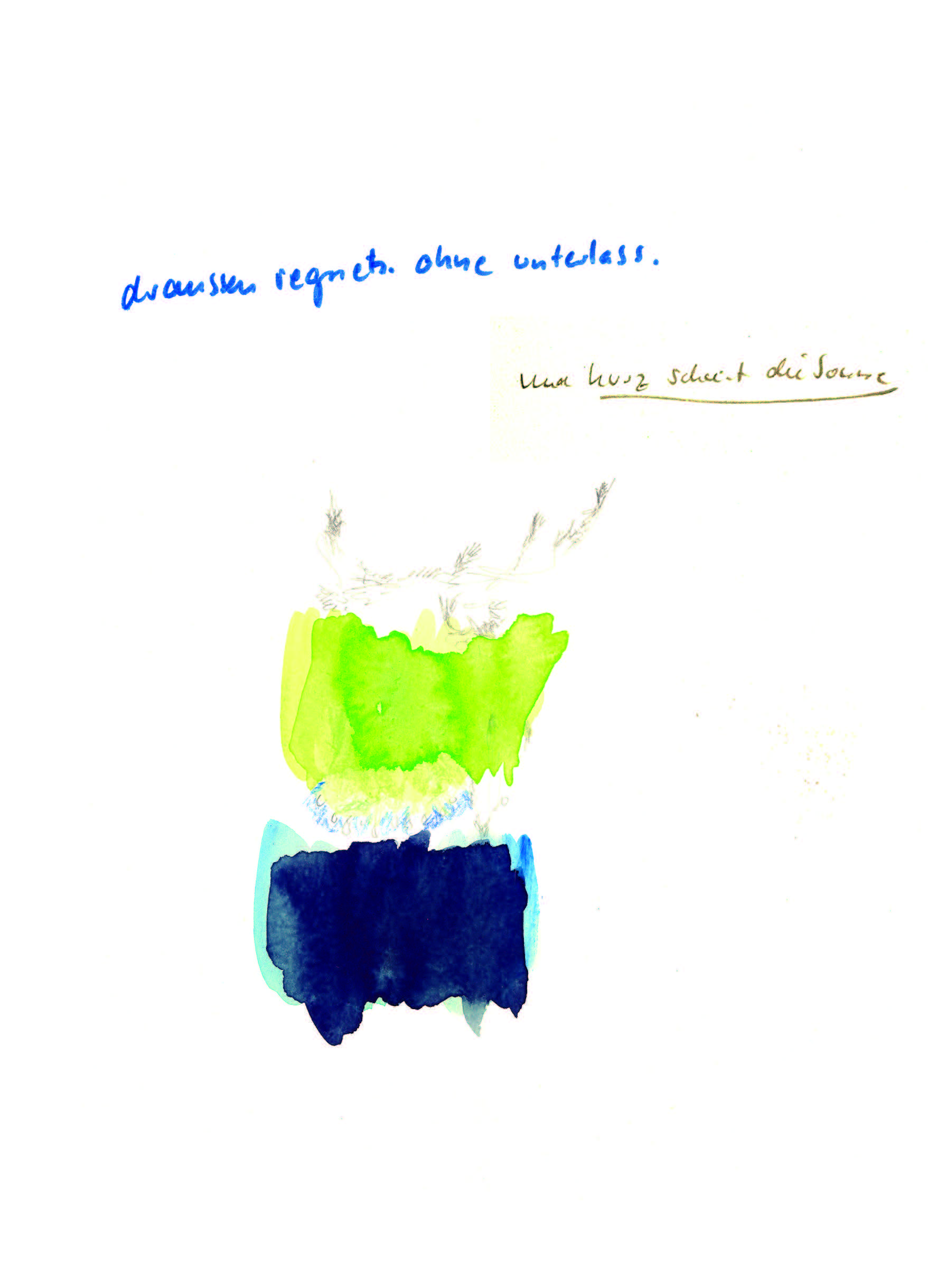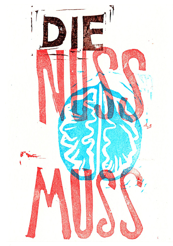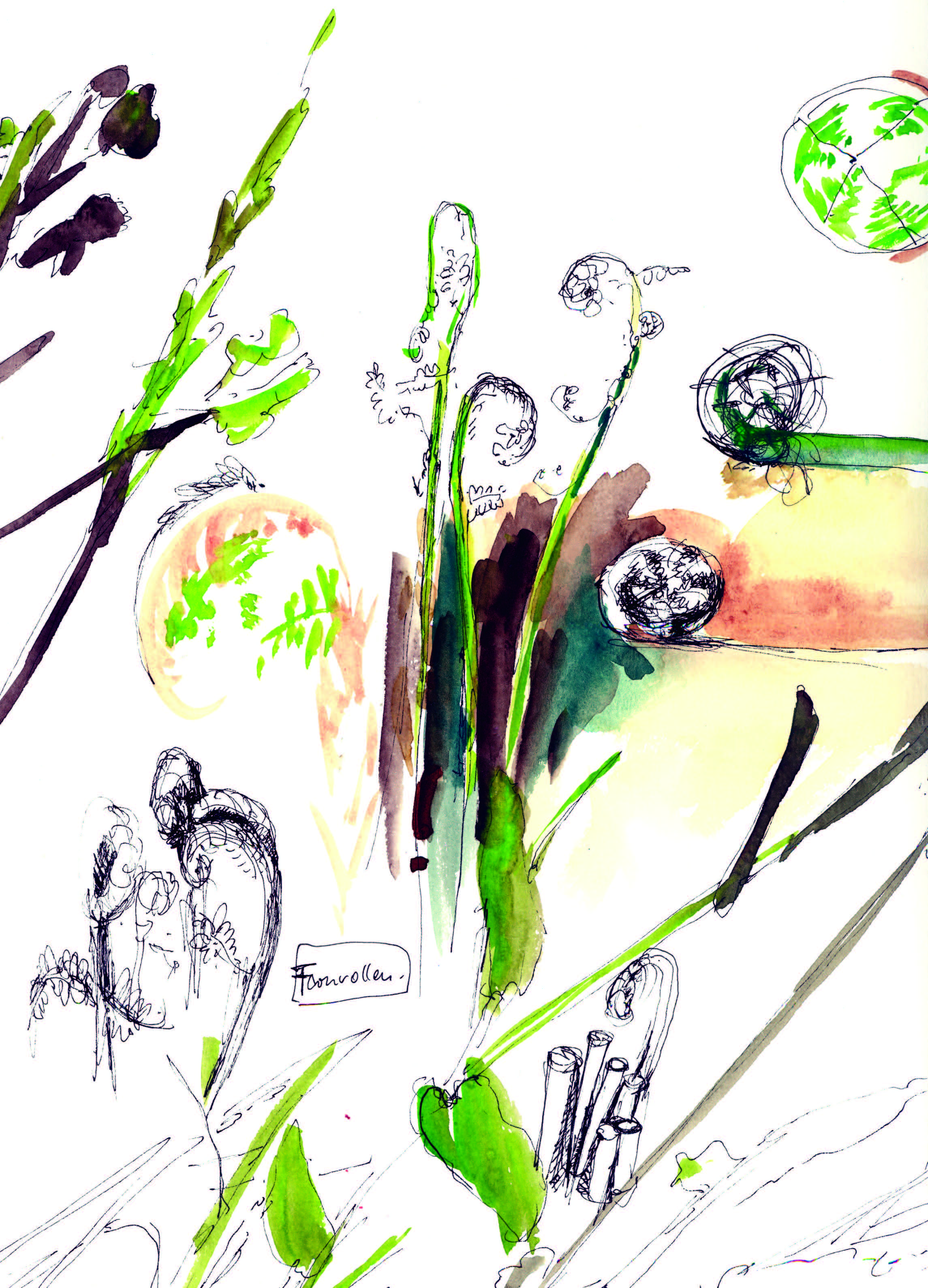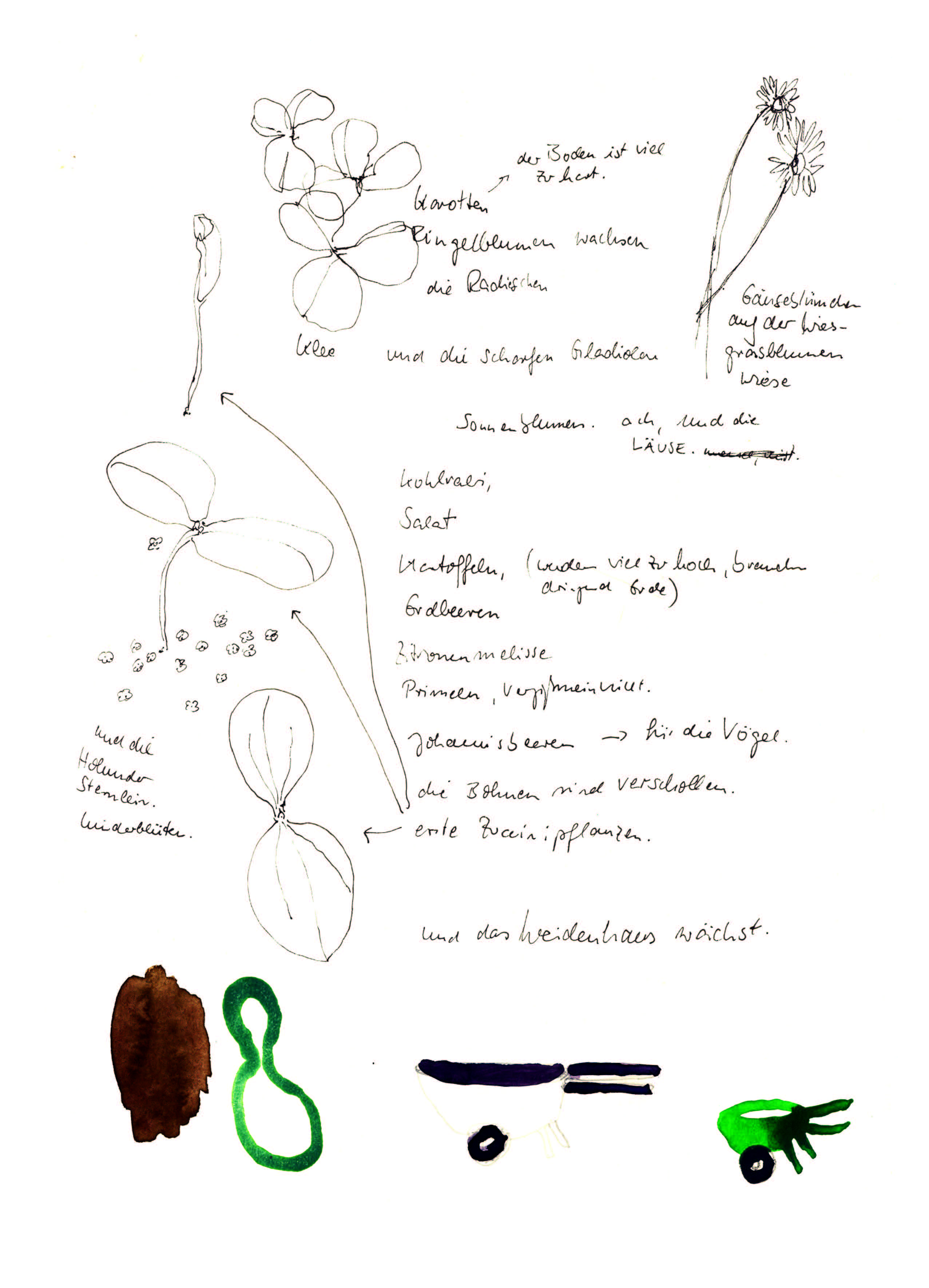Gartenzeichnungen Die Nuss muss – Stempeldruck auf Papier Es wächst – Aquarell, Kugelschreiber, Tuschestift auf Papier