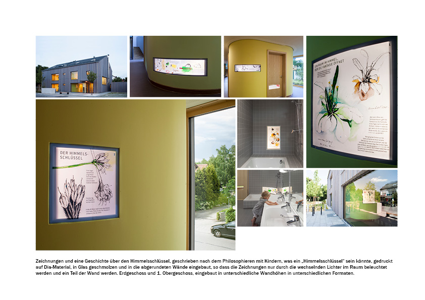 In Feldmoching werden Straßen nach heute immer seltener werdenden Wildblumen benannt. Die neu gebaute Kinderkrippe liegt in der Himmelschlüsselstraße. Karin Bergdolt greift mit ihren in die Architektur integrierten Glastafeln die Adresse mit ihrem Verweis auf die Pflanze und deren vielversprechenden Namen auf. Die Künstlerin setzt damit fort, was ihre Arbeit immer wieder leitet: Das Interesse an Architektur und am städtebaulichen Umfeld; der Blick auf scheinbar Marginales und Peripheres, auf Dinge und Ereignisse, die die Welt nicht einfach als kontrolliert, starr geordnet und unveränderlich erscheinen lassen. In engem Zusammenhang damit stehen die Anregung zur fantasievollen Überschreitung und die Einladung zur Partizipation.